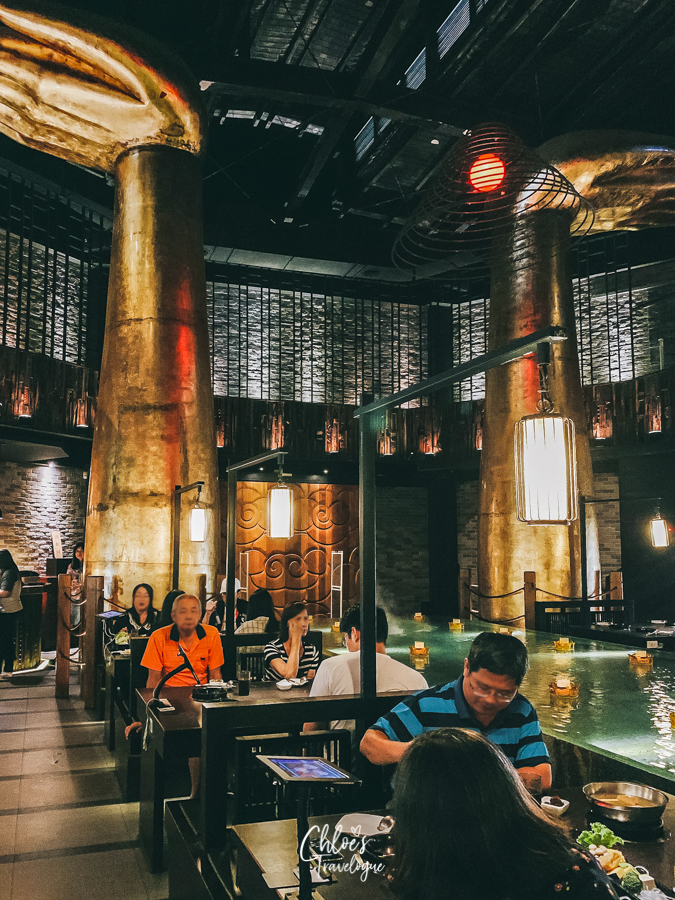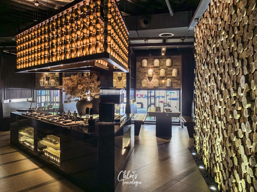 As the front door opens, a giant Buddha appears in the darkness at the end of a long water fountain with floating lanterns. The golden columns are Buddha’s arms holding up the ceiling. It feels as if you are dining in the secret Buddhist temple in the cave!