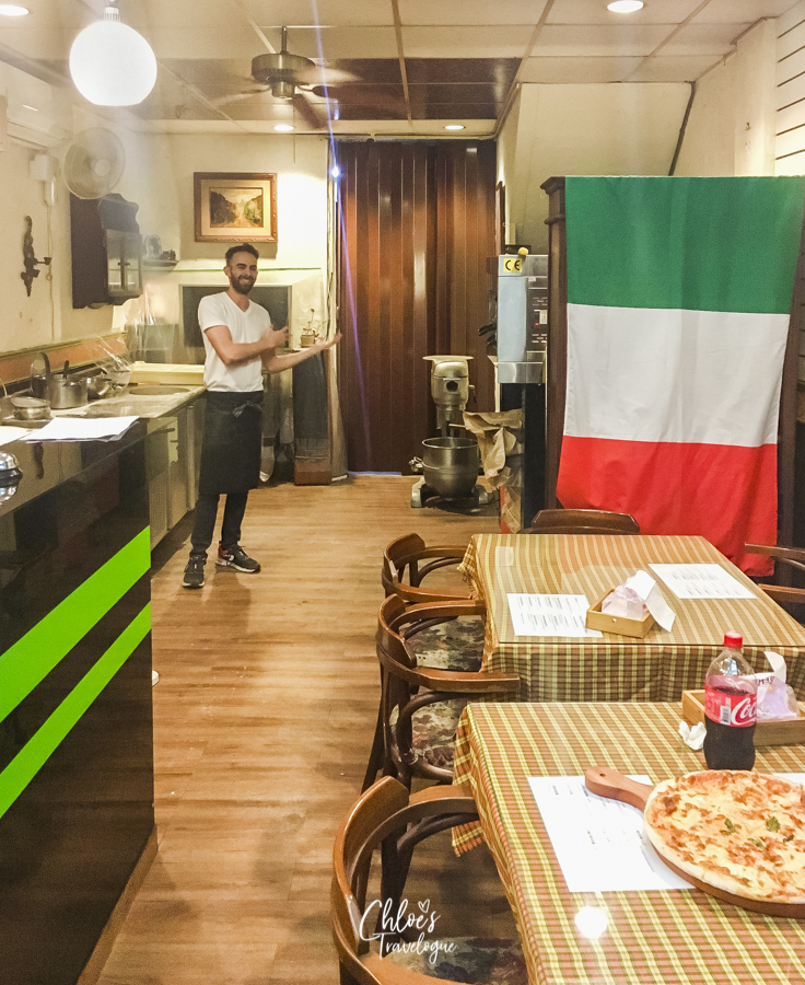 The menu sometimes changes as Andrea gets creative. As of now, there are ten pizzas on the menu: Margherita, Napoli, Capricciosa, Diavola, Pepperoni, Hawaiian, Bosco, Four Cheese, Marinara, and Nutella. It’s hard to pick the best from his menu because honestly all of them are excellent. (And I’ve tried them all!) But my favorites include Napoli with buffalo mozzarella and basil (my all-time favorite), Four Cheese (for cheese craving) and Diavola (for all the fresh chilies and jalapeños). As for the drinks, you can order German beers or carbonated beverages.