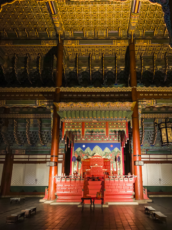The current hall was built in 1867 after getting burned down during the Japanese Invasion in 1592. Symbolizing the sacred monarchy, this largest hall in the palace stands high on top of stone steps. Behind the throne features a colorful painting of the Sun, Moon, and a five-peaked mountain. A pair of seven-clawed dragons, which signify the king and the state, decorates the ceiling of Geujeongjeon Hall. (see photos above)