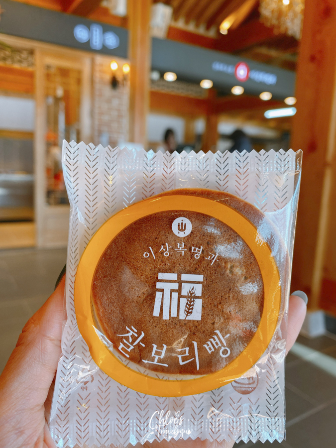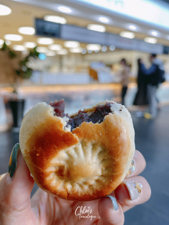 Hwangnam-ppang (황남빵; Hwangnam referring to the region and ppang meaning bread in Korean) is a small round bread with sweet red bean paste inside. Whereas, Chalbori-ppang (찰보리빵; Chalbori referring to barley) is a red bean pancake made of barley powder. Both are quite tasty. If you like red bean pastry, try them out!