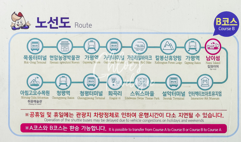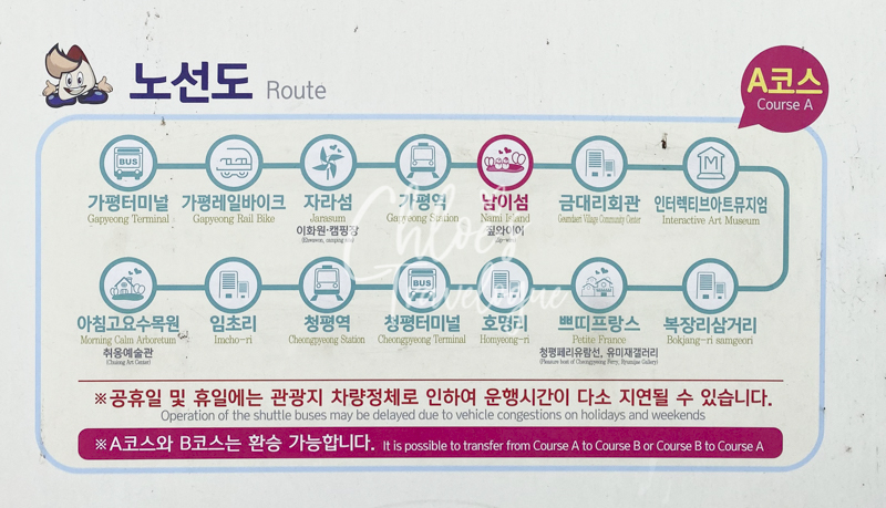 - Before you go into Nami Island, check the bus stop. Make sure you are waiting for the bus in the right direction. The opposite direction will take you back to Gapyeong Station.