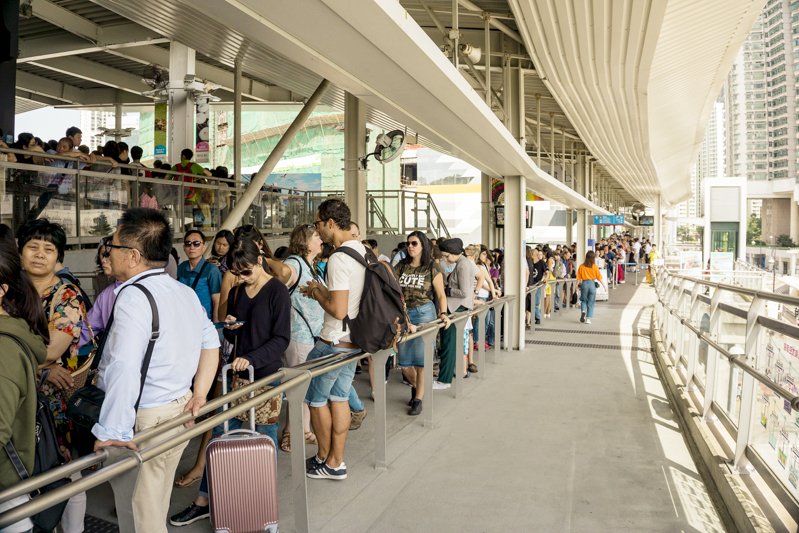 The cable car starts to operate at 10 a.m. To beat the crowd, I got there around 9:30 a.m., thinking I would bypass the line to simply pick up my ticket and go straight to the ride. Wrong! Despite “no-queuing” promises from online booking services, there was a long waiting line. Although advanced booking line seemed to be shorter at first, it didn’t matter in the end because they opened ONE designated counter for online purchases as opposed to six other counters for on-site purchases. My strategy failed! I was sweating in the Hong Kong’s sticky, humid air for one full hour to pick up my ticket. Ugh.