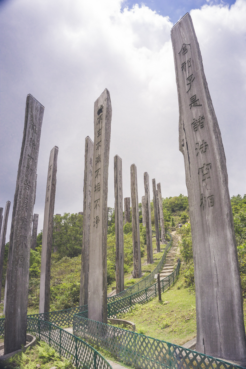 Wisdom Path is a short trail on top of the hill, featuring a series of tall wooden columns. The columns display Buddhist verses in Chinese that contain the profound wisdom from the Heart Sutra, the best-known Buddhist scripture. And all 38 of them stand in a sideways 8 formation, representing infinity.