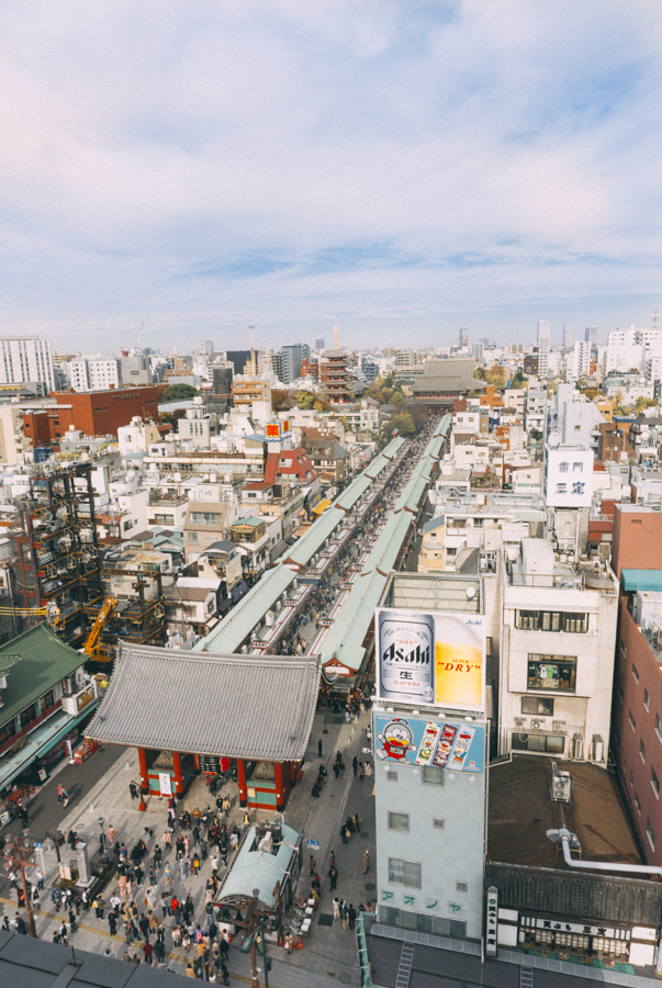 Check out the Sky Terrace observation deck on the 8th floor of the Asakusa Culture Tourist Information Center. You can enjoy the unobstructed view of the Tokyo Skytree and Asahi Beer Tower “Golden Flame” on one side and a bird’s eye view of Nakamise street and Sensoji temple on the other side. The best part? It’s free!