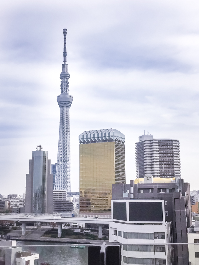 I chose not to go up because I prefer to see the tower from outside, rather than looking out from the tower. The tower is located across the Sumida River from Asakusa, neighboring Asahi Beer Tower. When I came out of the Tokyo Metro Ginza Line Asakusa station exit 4, I could take photos of both towers. For me, it was enough.