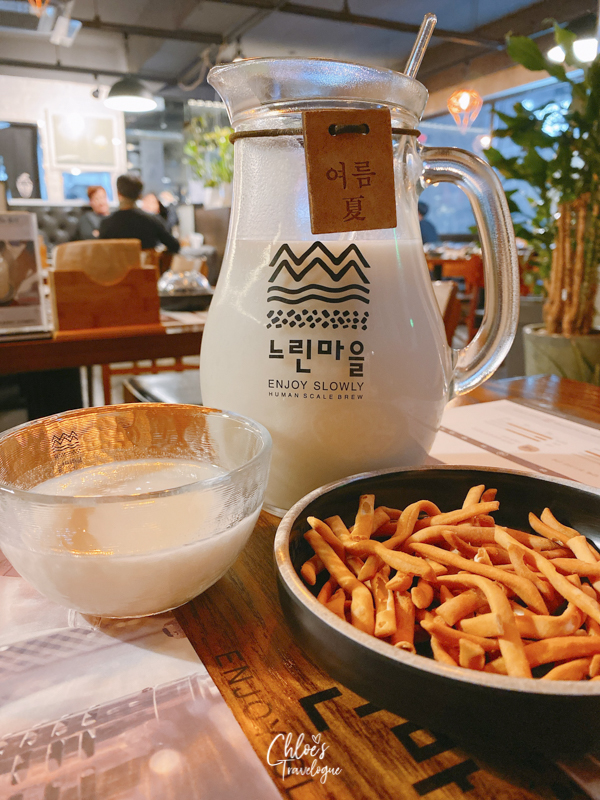 Slow Brew Pub is a makgeolli bar with multiple locations in Korea. Although it is a franchise, their makgeolli is not mass-produced like the ones you find at a convenience store. Each pub brews its makgeolli on the spot, which you can see through the glass window. Slow Brew Pub offers four different makgeolli (spring, summer, fall, and winter) with flavors varying by the fermentation time. The food pairing is also excellent.