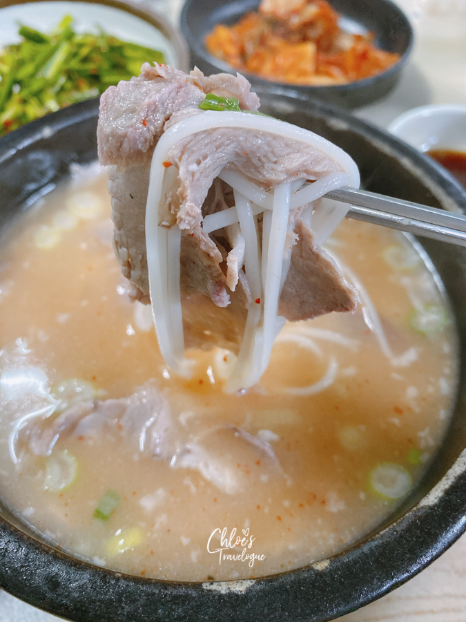Pork bones are braised for many hours in a vat with rice wine, garlic, and other seasonings. Before serving, the milky broth is poured into a Korean clay pot with rice and glass noodles. If you make close observation on the preparation process, you might be able to witness toryeom, a Korean method of warming up rice/noodles and clay pot by pouring and draining hot broth repeatedly. Then, the bowl of Gukbap is topped with thick slices of pork.