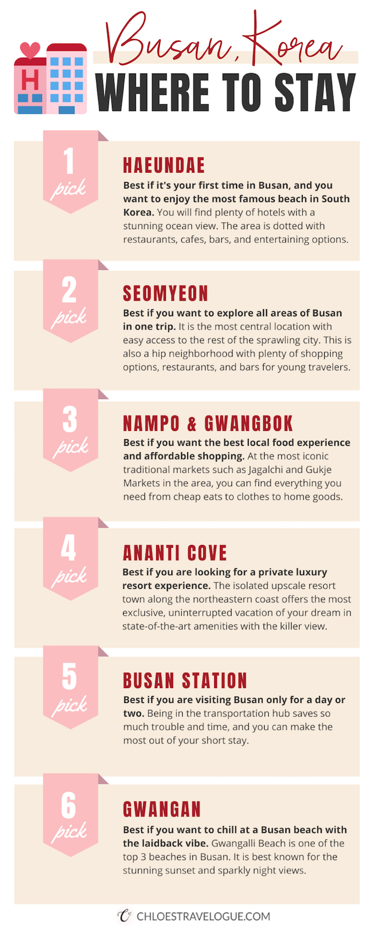 - Stay in Haeundae if it is your first time in Busan, and you want to enjoy the most famous beach in South Korea. Here, you will find plenty of hotel options with a stunning ocean view. The Haeundae area is dotted with entertaining options such as restaurants, cafes, and bars.
