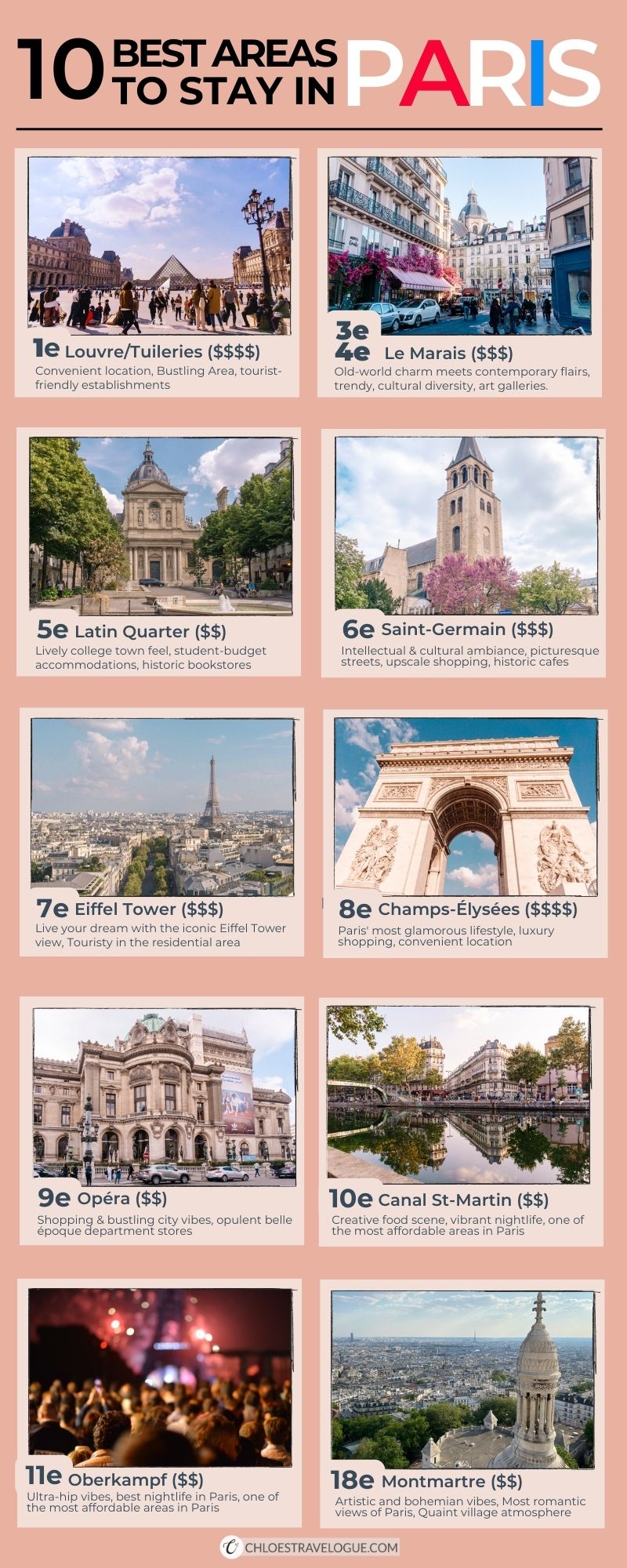 To go straight to the point, here is a summary of the best places to stay in Paris first time. This infographic highlights the best arrondissement (e.g., 1e = 1st arrondissement) , why I recommend the particular neighborhood and the budget range.
