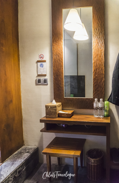 Although the room was not big, it had almost everything you need – except a toilet. The tub was large enough for two tall adults to immerse comfortably. There was a shower to wash before and after bathing. You could lie down on a waterproof lounge chair in between soaking. (You should not really be in hot water too long at a time.) A vanity table with a hairdryer and other amenities is sufficient.